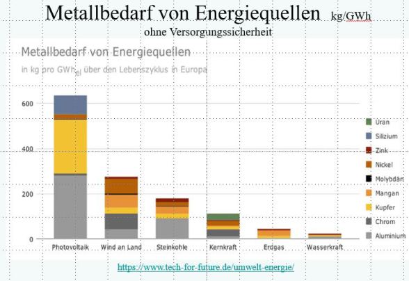 Genauso fragwürdig ist die gesamte deutsche Stromwende. Nachfolgend wird der gigantische Materialbedarf von Windkraft und Photovoltaik sowie die schlechte Energieausbeute dieser volatilen Stroerzeugungsformen gezeigt.