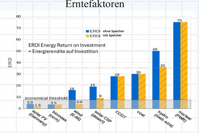 Sollen Windkraftwerke und Photovoltaik auch "netzdienlich" sein, d.h. mit zusätzlichen Stromerzeugern sicherstellen, dass sie zu jeder Zeit Strom liefern, muß fast soviel Energie investiert werden wie herausgeholt wird.
