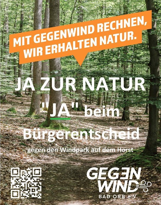 In einer von den Bürgerinitiativen Gegenwind Bad Orb und BI Windkraft im Spessart - In Einklang mit Mensch und Natur initiierten Unterschriftenaktion bekannten sich 2.725 Menschen für den Erhalt des Naturparks Spessart zwischen Bad Orb und Bieber als unzerstörtes Natur- und Erholungsgebiet. Die Unterzeichner setzen sich für den Erhalt des Waldes als Ökosystemleister und Erholungsort der Menschen vor Ort ein, für den Schutz von Flora und Fauna und für die Sicherstellung unserer vorzüglichen Trinkwasserversorgung.